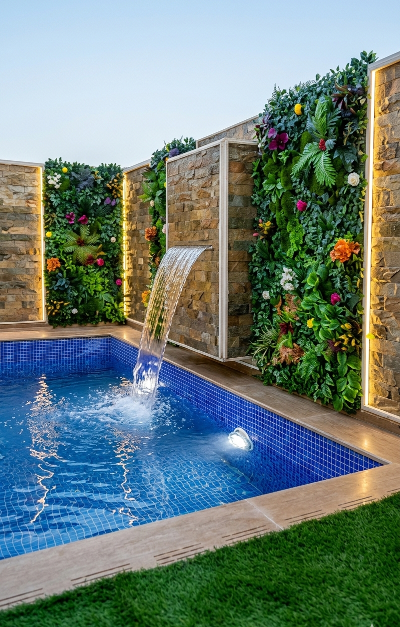 Mur végétal sur mesure, vendu au mètre carré, pour transformer votre terrasse avec piscine en un espace moderne et raffiné au Maroc